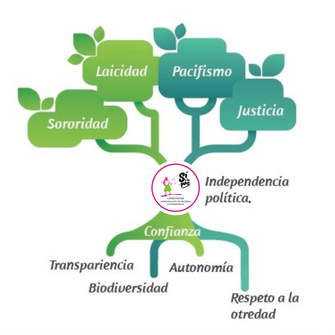 Nuestros principios y enfoques se entretejen por el bien común y se sostienen en la biodiversidad, laicidad, pacifismo, autonomía, confianza, sororidad, justicia, transparencia, respeto a la otredad, autonomía e independencia política.