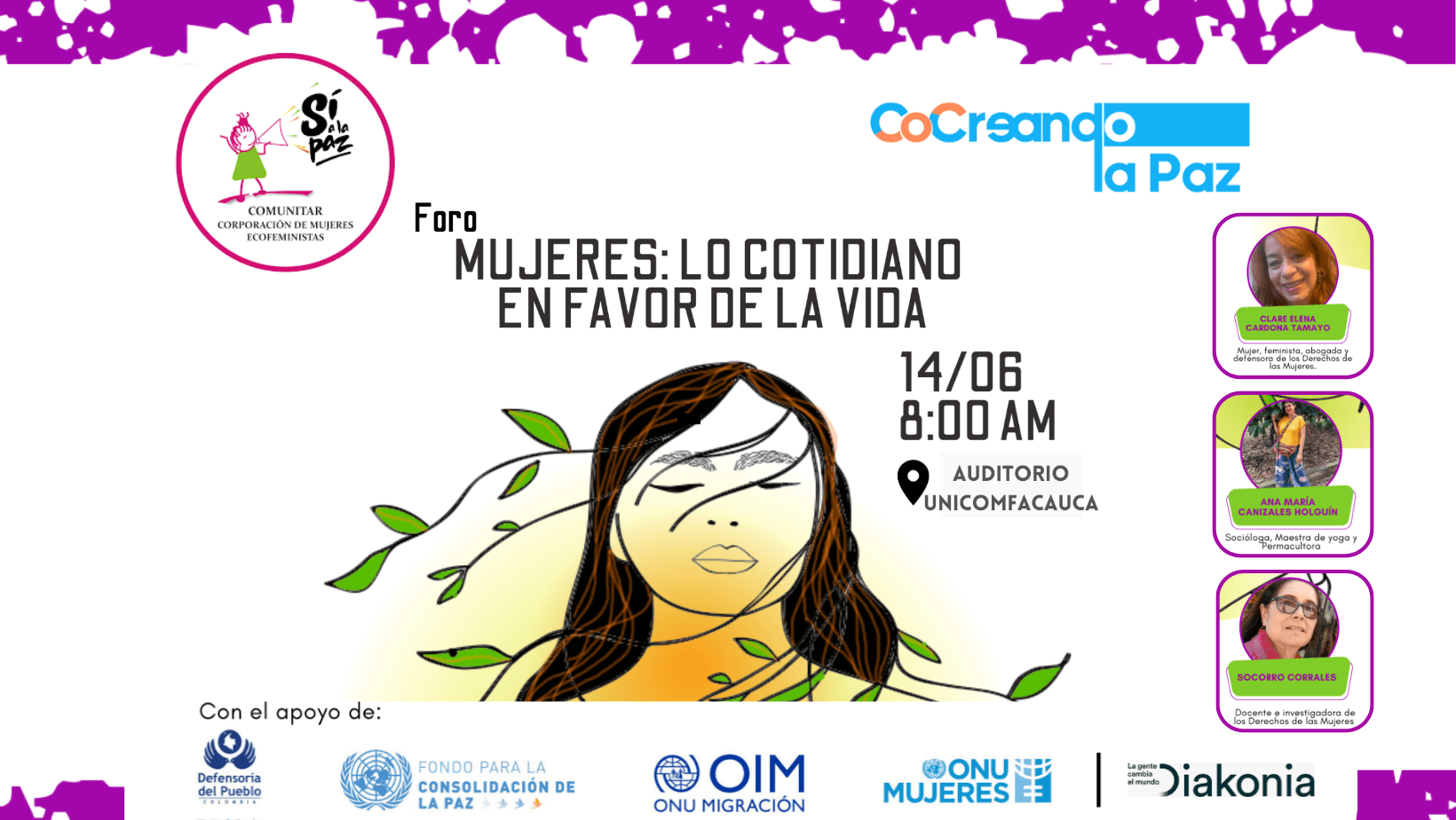 La Corporación de Mujeres Ecofeministas Comunitar Y COcreando La Paz con el apoyo de Defensoría del Pueblo Colombia, Fondo para la consolidación de la paz, OIM, ONU mujeres; y DIAKONIA invita al "Foro mujeres: Lo cotidiano en favor de la vida", evento que contará con grandes invitadas como: